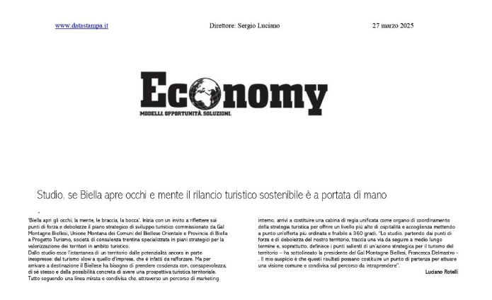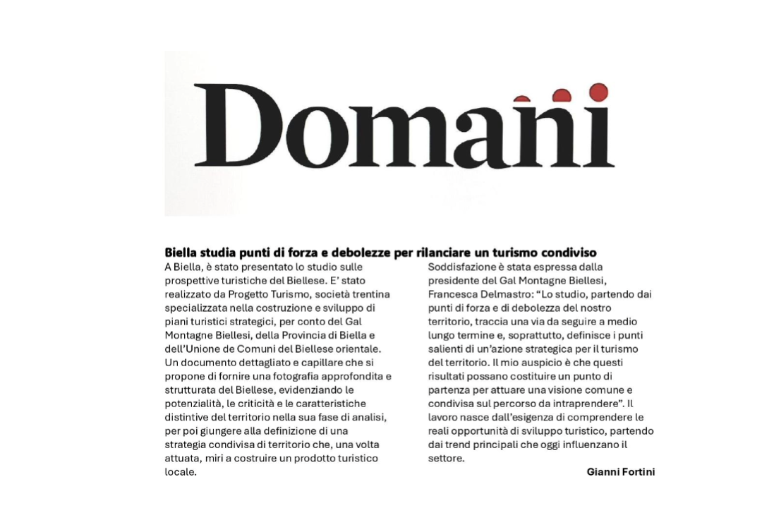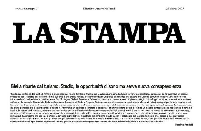 Particolarmente soddisfatto il presidente del Gal Montagne Biellesi Francesca Delmastro . “Lo studio, partendo dai punti di forza e di debolezza del nostro territorio, traccia una via da seguire a medio lungo termine e, soprattutto, definisce i punti salienti di un’azione strategica per il turismo del territorio. Il mio auspicio è che questi risultati possano costituire un punto di partenza per attuare una visione comune e condivisa sul percorso da intraprendere”. Questo lavoro nasce dall’esigenza di comprendere le reali opportunità di sviluppo turistico, partendo dai trend principali che oggi influenzano il settore.