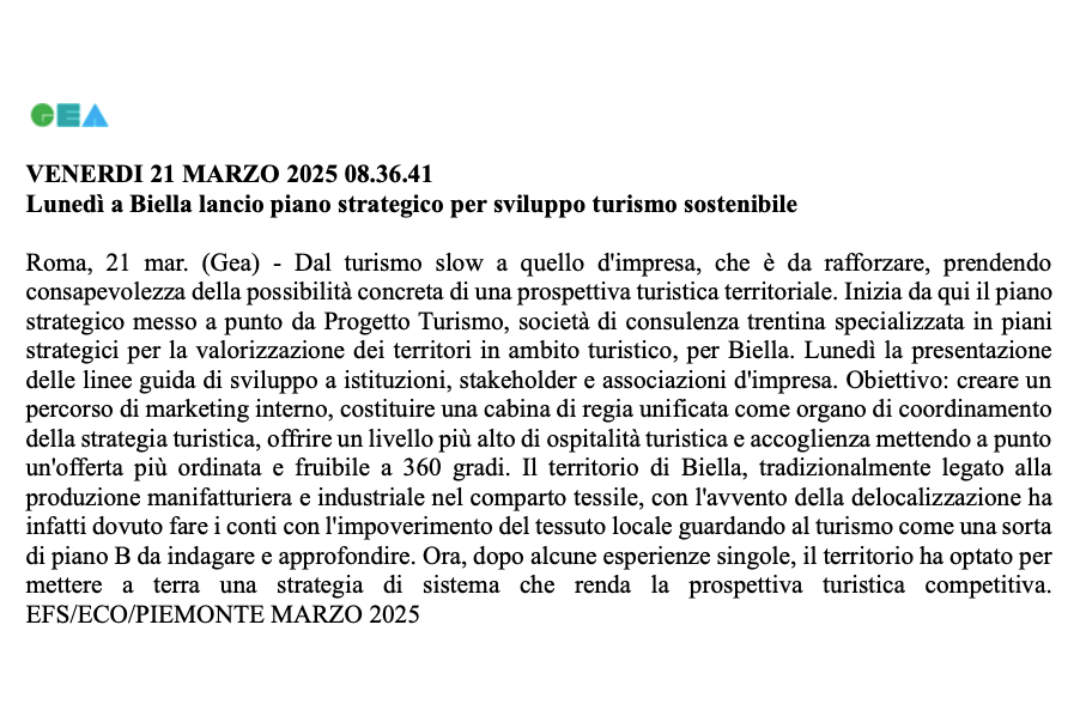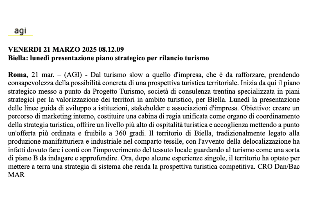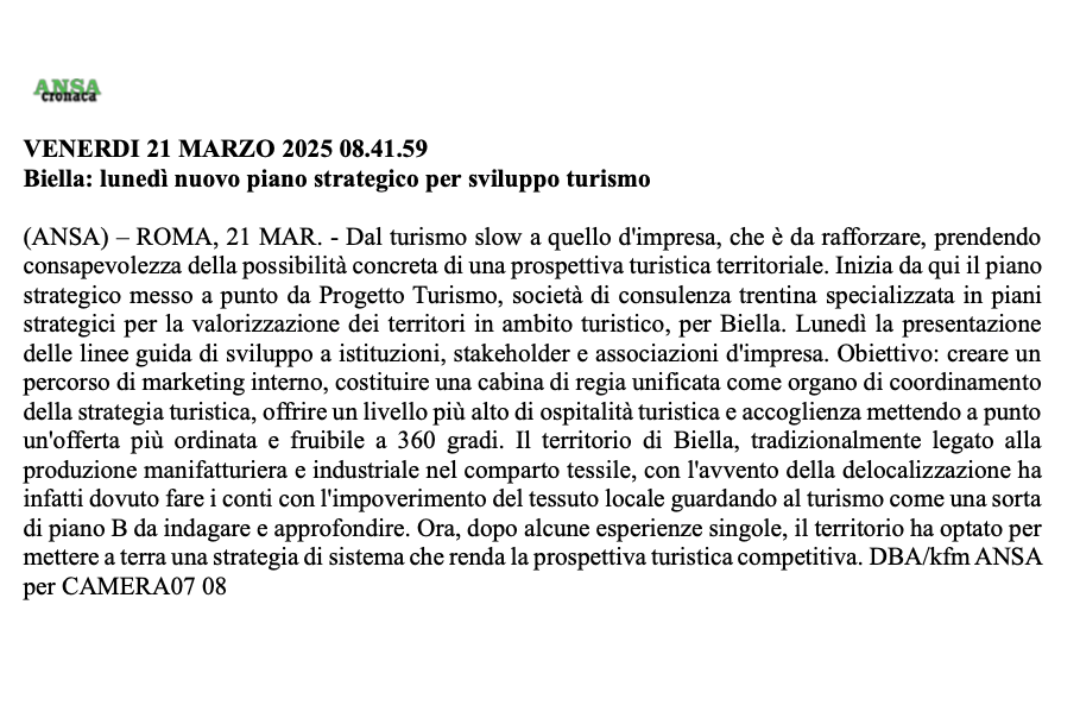 Si tratta di un documento dettagliato e capillare che si propone di fornire una fotografia approfondita e strutturata del Biellese, evidenziando le potenzialità, le criticità e le caratteristiche distintive del territorio nella sua fase di analisi, per poi giungere alla definizione di una strategia condivisa di territorio che, una volta attuata, miri a costruire un prodotto turistico locale.