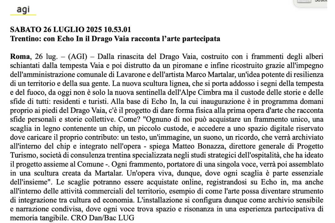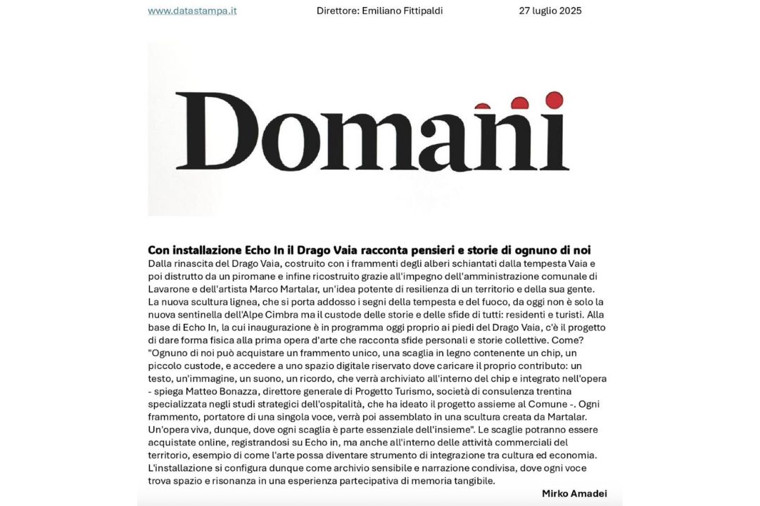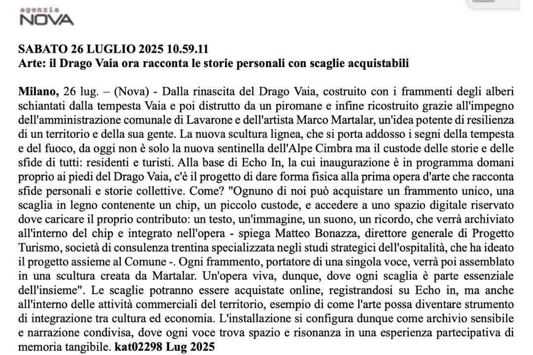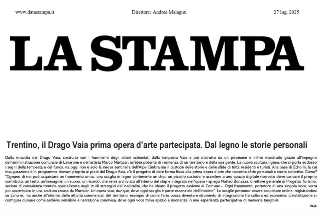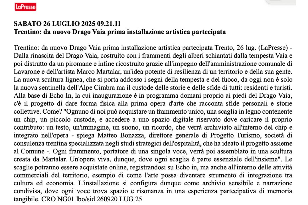 Alla base di Echo In, la cui inaugurazione è avvenuta ieri proprio ai piedi del Drago Vaia, c’è il progetto di dare forma fisica alla prima opera d’arte che racconta sfide personali e storie collettive. Come? “Ognuno di noi può acquistare un frammento unico, una scaglia in legno contenente un chip, un piccolo custode, e accedere a uno spazio digitale riservato dove caricare il proprio contributo: un testo, un'immagine, un suono, un ricordo, che verrà archiviato all'interno del chip e integrato nell'opera – spiega Matteo Bonazza, direttore generale di Progetto Turismo, società di consulenza trentina specializzata negli studi strategici dell’ospitalità, che ha ideato il progetto assieme al Comune -. Ogni frammento, portatore di una singola voce, verrà poi assemblato in una scultura creata da Martalar. Un’opera viva, dunque, dove ogni scaglia è parte essenziale dell’insieme”.