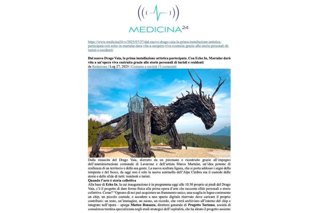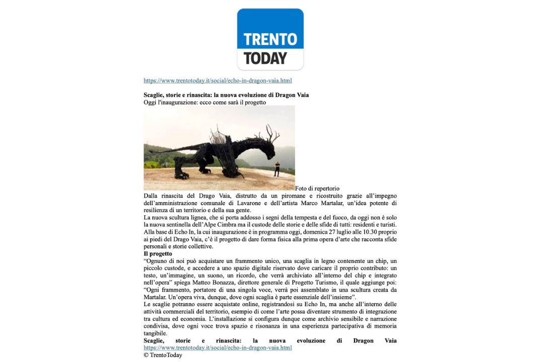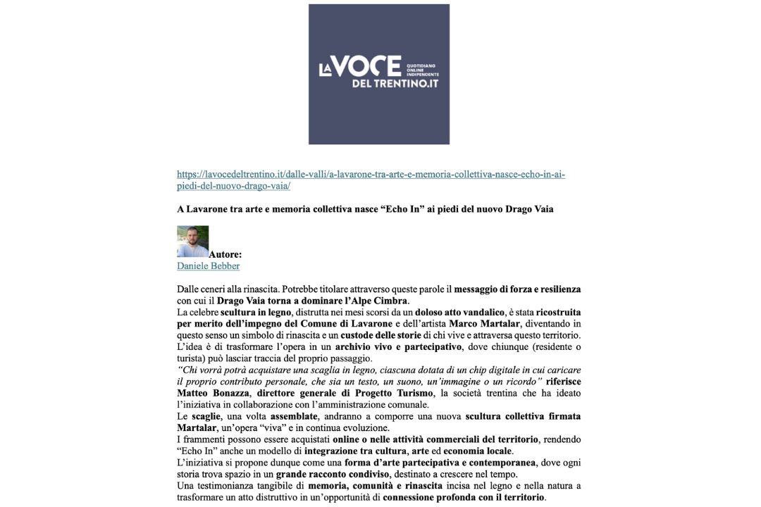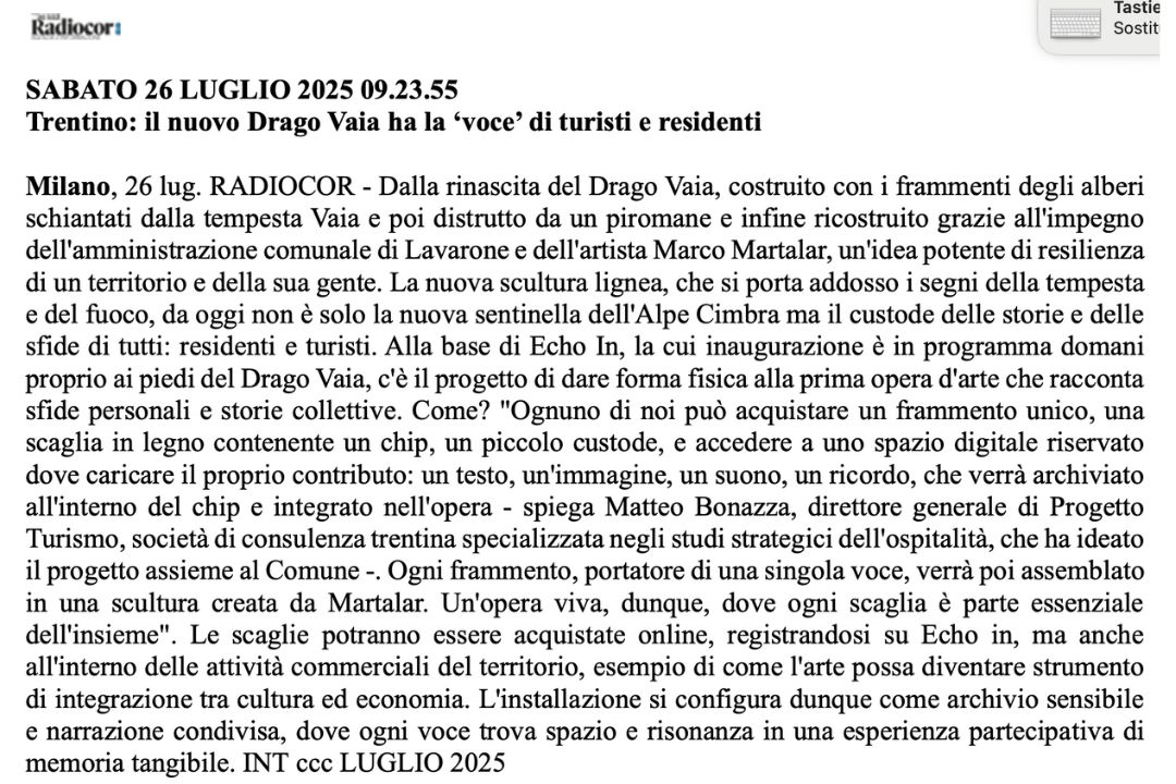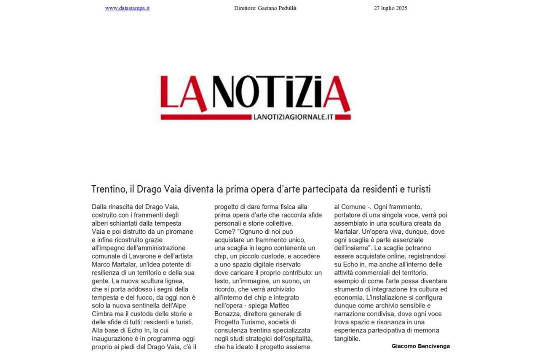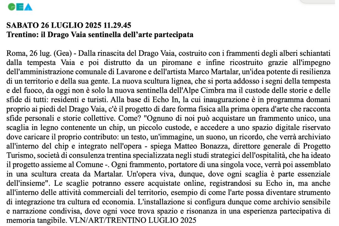 Alla base di Echo In, la cui inaugurazione è avvenuta ieri proprio ai piedi del Drago Vaia, c’è il progetto di dare forma fisica alla prima opera d’arte che racconta sfide personali e storie collettive. Come? “Ognuno di noi può acquistare un frammento unico, una scaglia in legno contenente un chip, un piccolo custode, e accedere a uno spazio digitale riservato dove caricare il proprio contributo: un testo, un'immagine, un suono, un ricordo, che verrà archiviato all'interno del chip e integrato nell'opera – spiega Matteo Bonazza, direttore generale di Progetto Turismo, società di consulenza trentina specializzata negli studi strategici dell’ospitalità, che ha ideato il progetto assieme al Comune -. Ogni frammento, portatore di una singola voce, verrà poi assemblato in una scultura creata da Martalar. Un’opera viva, dunque, dove ogni scaglia è parte essenziale dell’insieme”.