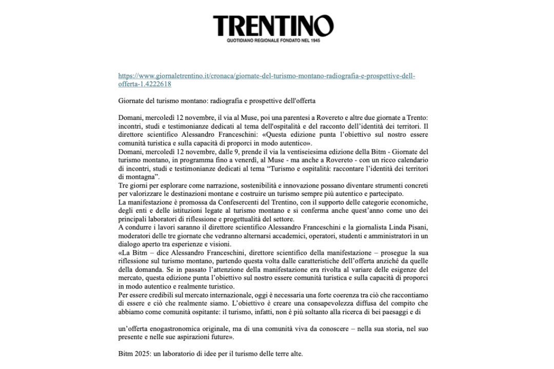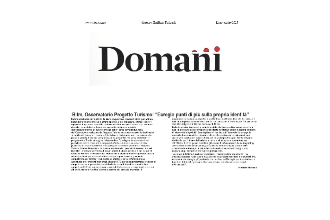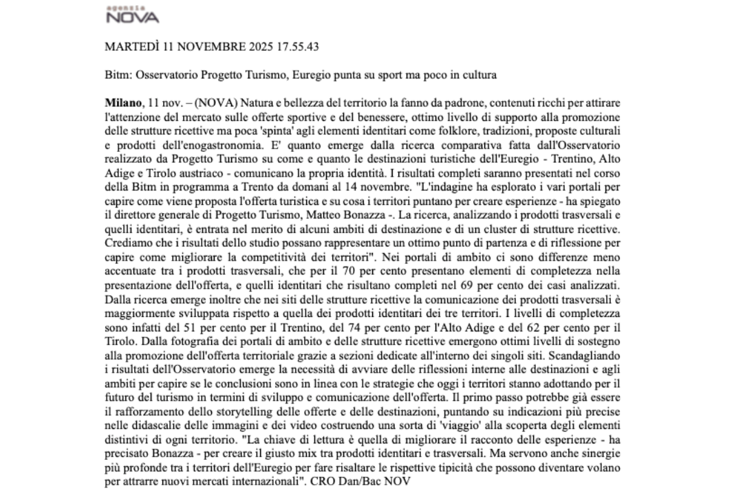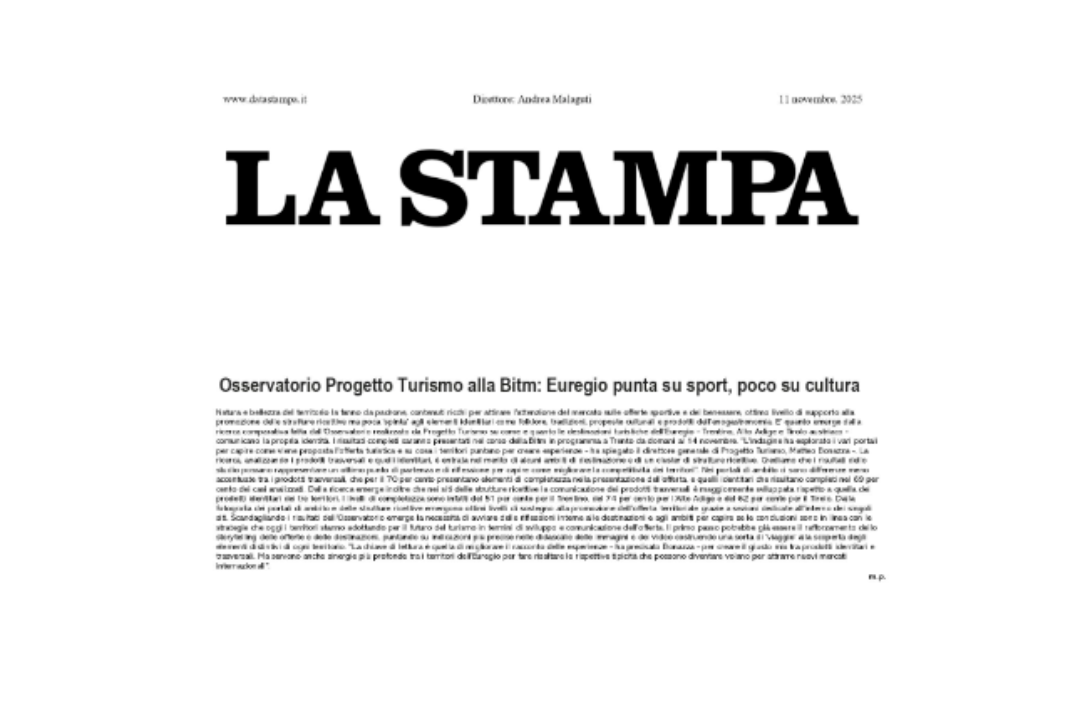 La ricerca scandaglia dunque l’equilibrio tra la comunicazione degli elementi identitari e prodotti o servizi offerti e come si intersecano per creare esperienze uniche per l'ospite. I risultati attesi? Verificare, come mai fatto prima, quanto le destinazioni dell'Euregio mettano in risalto le proprie caratteristiche identitarie nella comunicazione turistica, stimolare una riflessione tra gli attori del sistema turistico, porre le basi per approfondimenti futuri e comprendere il supporto delle strutture ricettive alla valorizzazione dell'offerta territoriale.