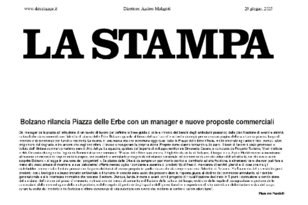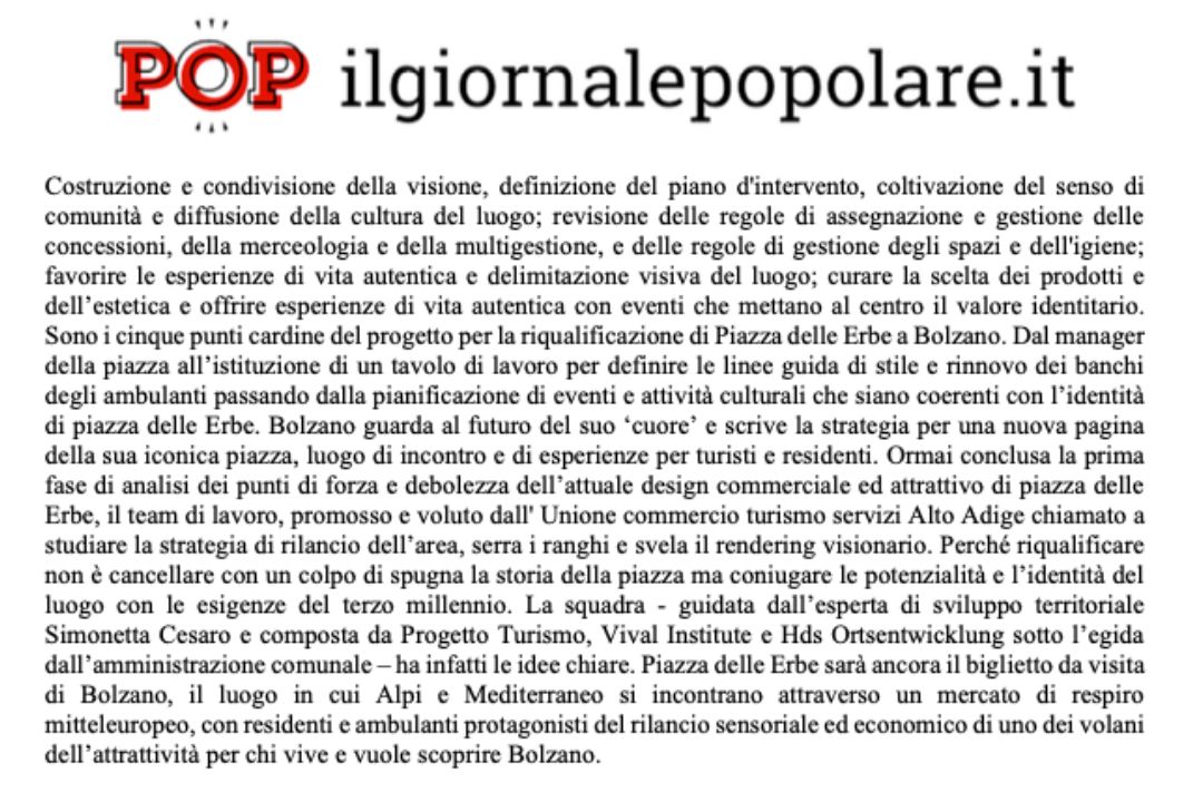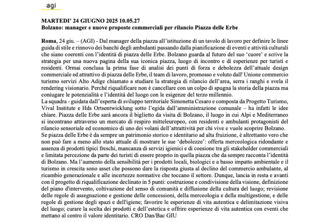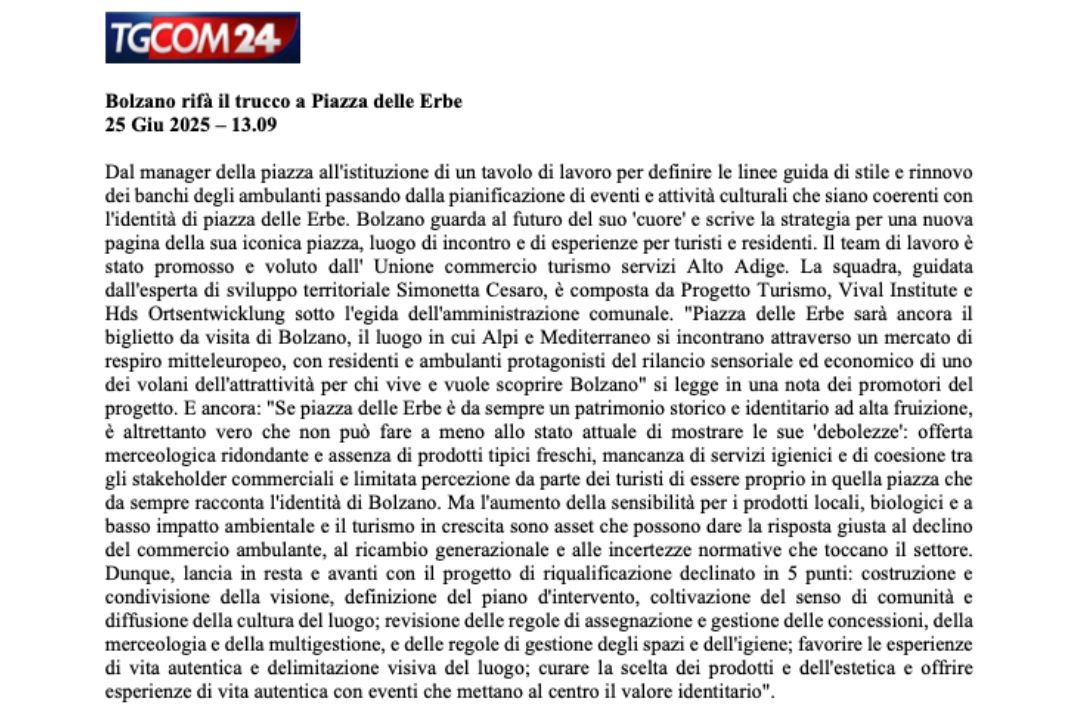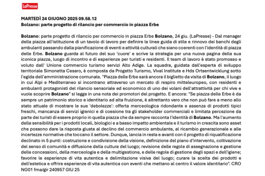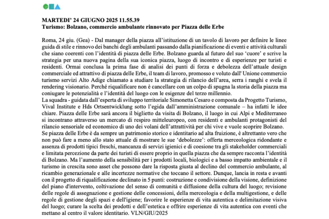 La squadra - guidata dall’esperta di sviluppo territoriale Simonetta Cesaro e composta da Progetto Turismo, Vival Institute e Hds Ortsentwicklung sotto l’egida dall’amministrazione comunale – ha infatti le idee chiare. Piazza delle Erbe sarà ancora il biglietto da visita di Bolzano, il luogo in cui Alpi e Mediterraneo si incontrano attraverso un mercato di respiro mitteleuropeo, con residenti e ambulanti protagonisti del rilancio sensoriale ed economico di uno dei volani dell’attrattività per chi vive e vuole scoprire Bolzano.